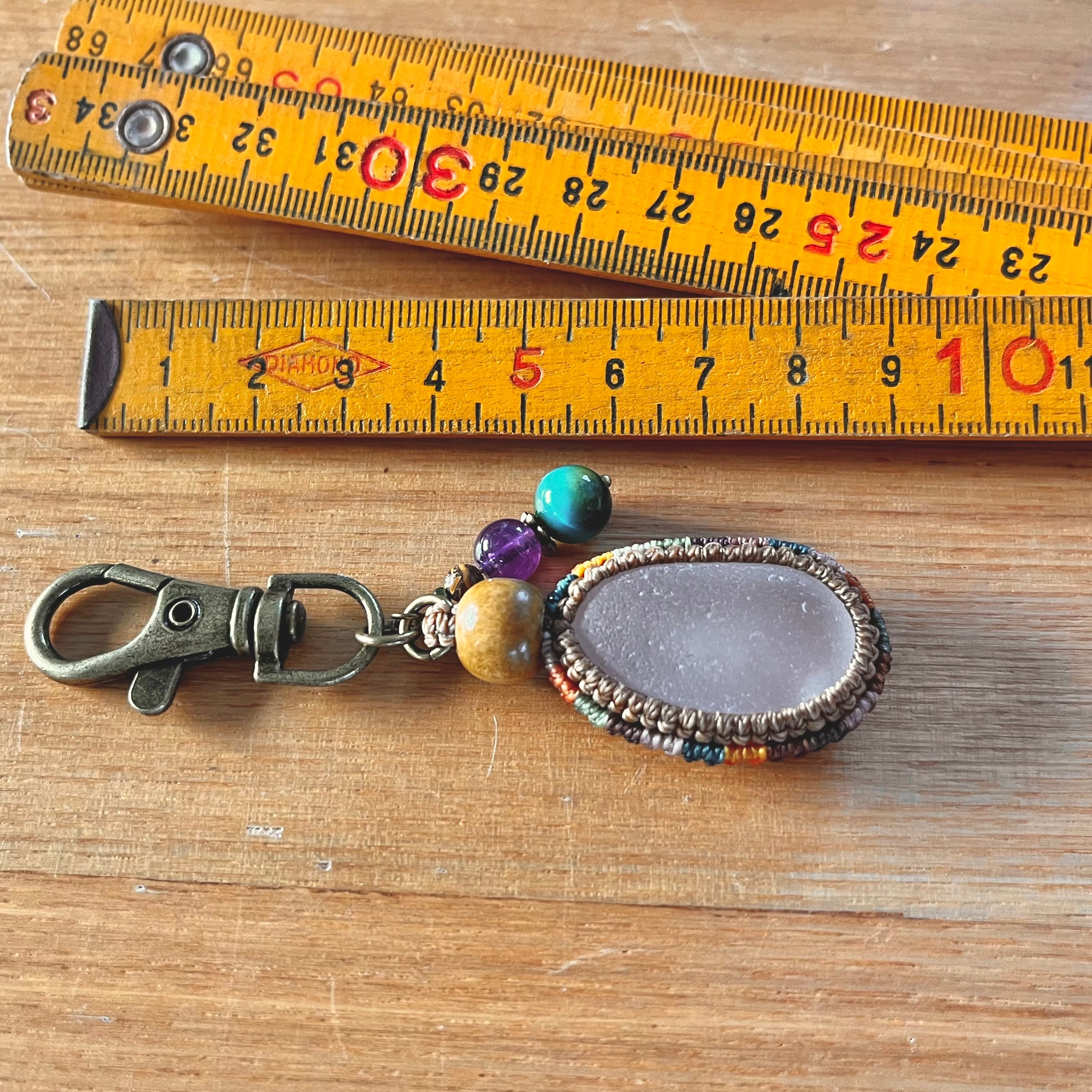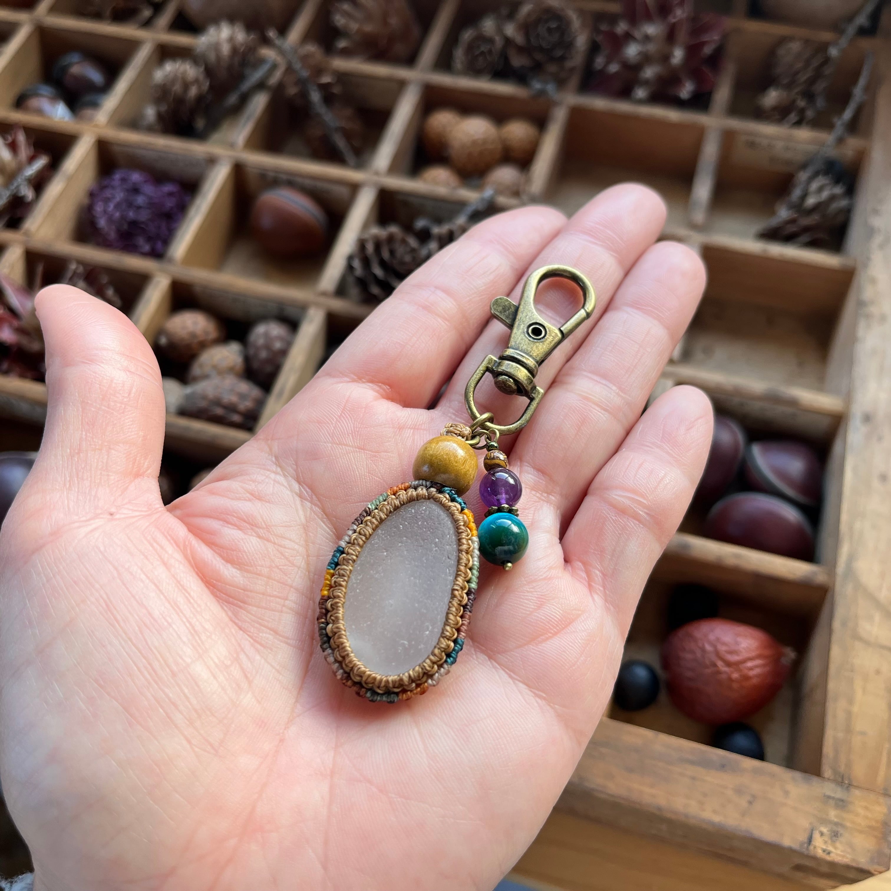 いつもは単色で編んでいる、ふち編みのシーグラスのマクラメキーホルダーですが、余った糸を活かしたいと思い、ライオン編みで編んでみたところ、表情豊かで良い感じに仕上がりました!(((o(*゚▽゚*)o)))