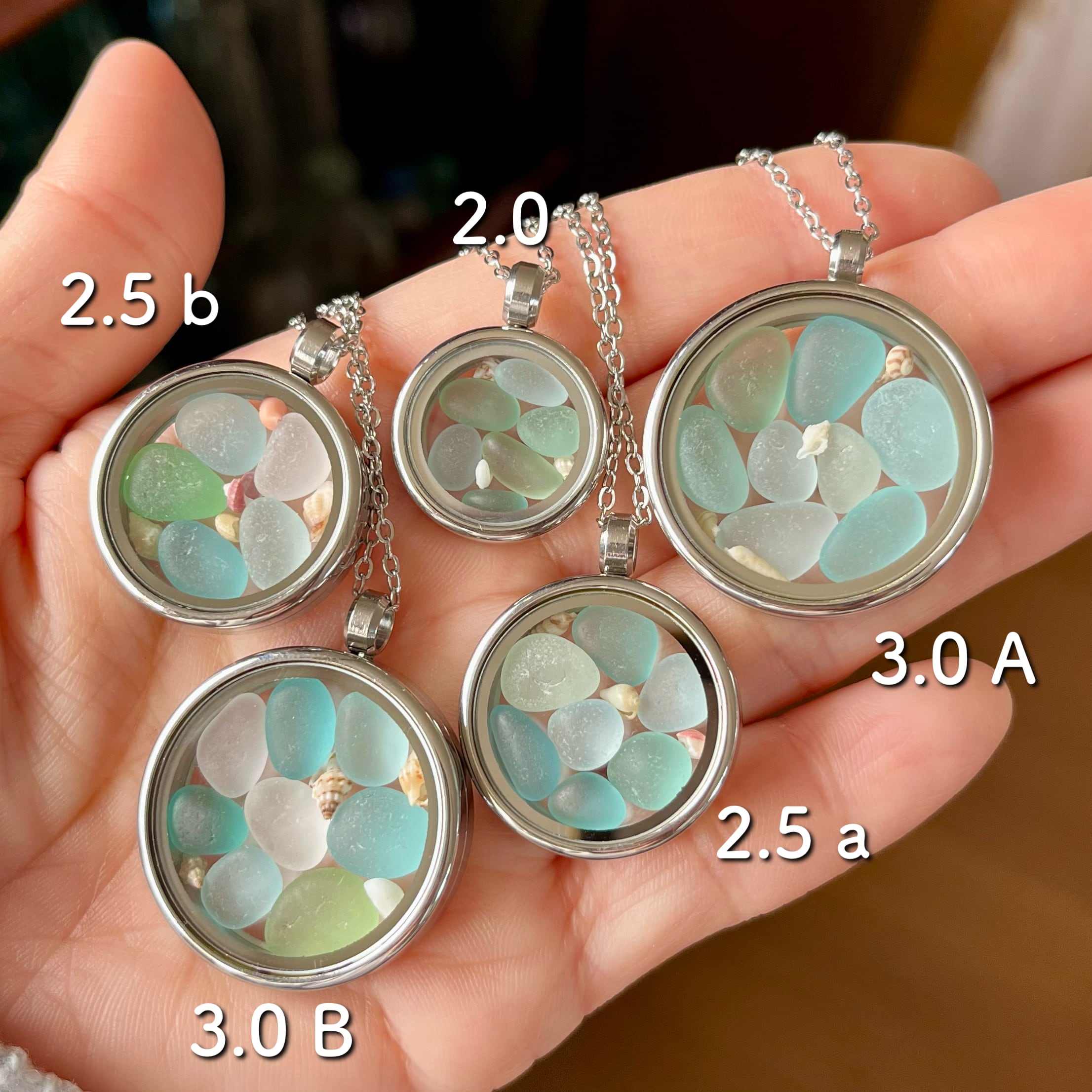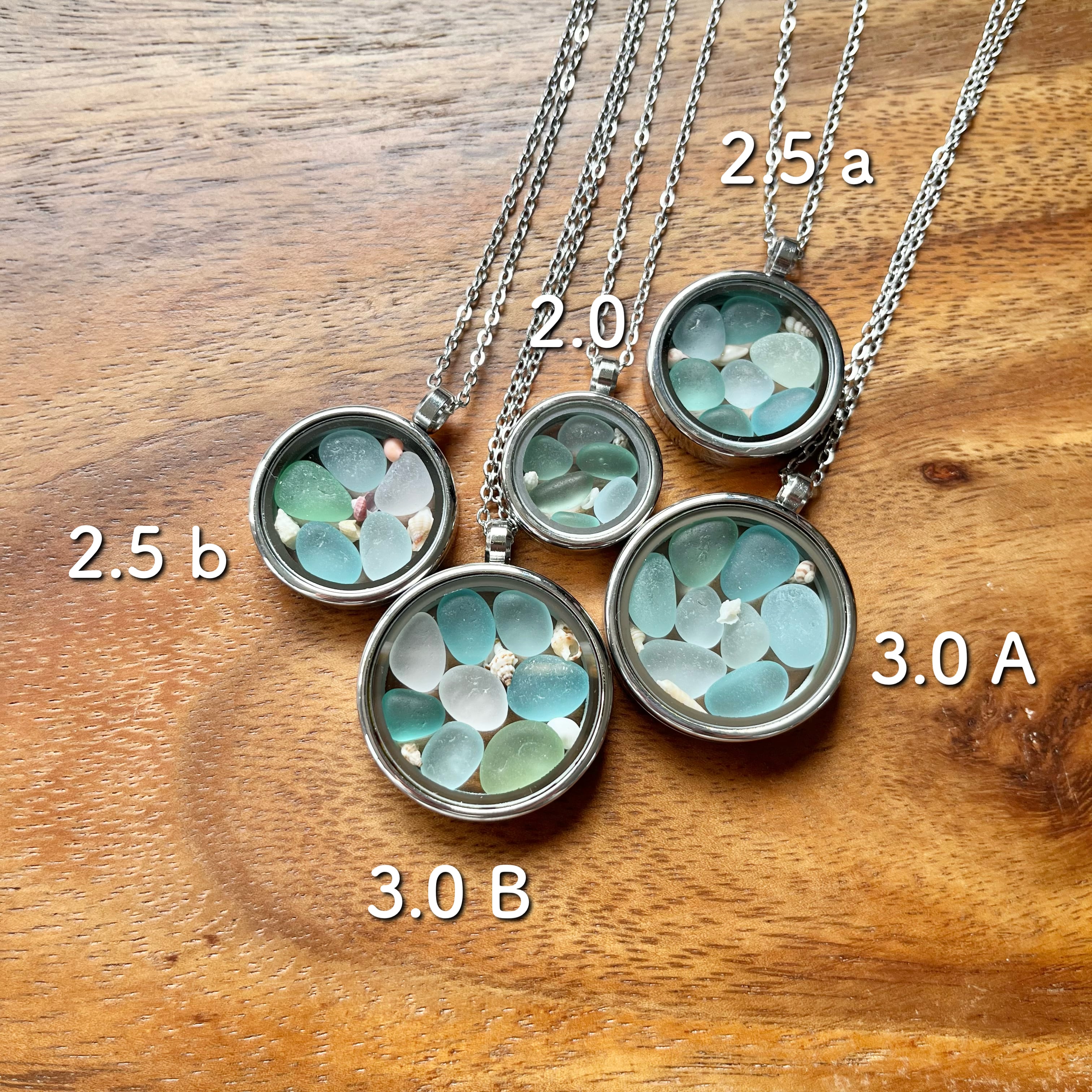 美しい ミニシーグラスを、色々な角度から お楽しみいただけるよう、両面ガラスのケースに封入しました。ガラス同士、硬度が同じ。なるべく動いて傷がついてしまわぬよう、微小貝も封入してみました。お好みで、足したり引いたりしてください。