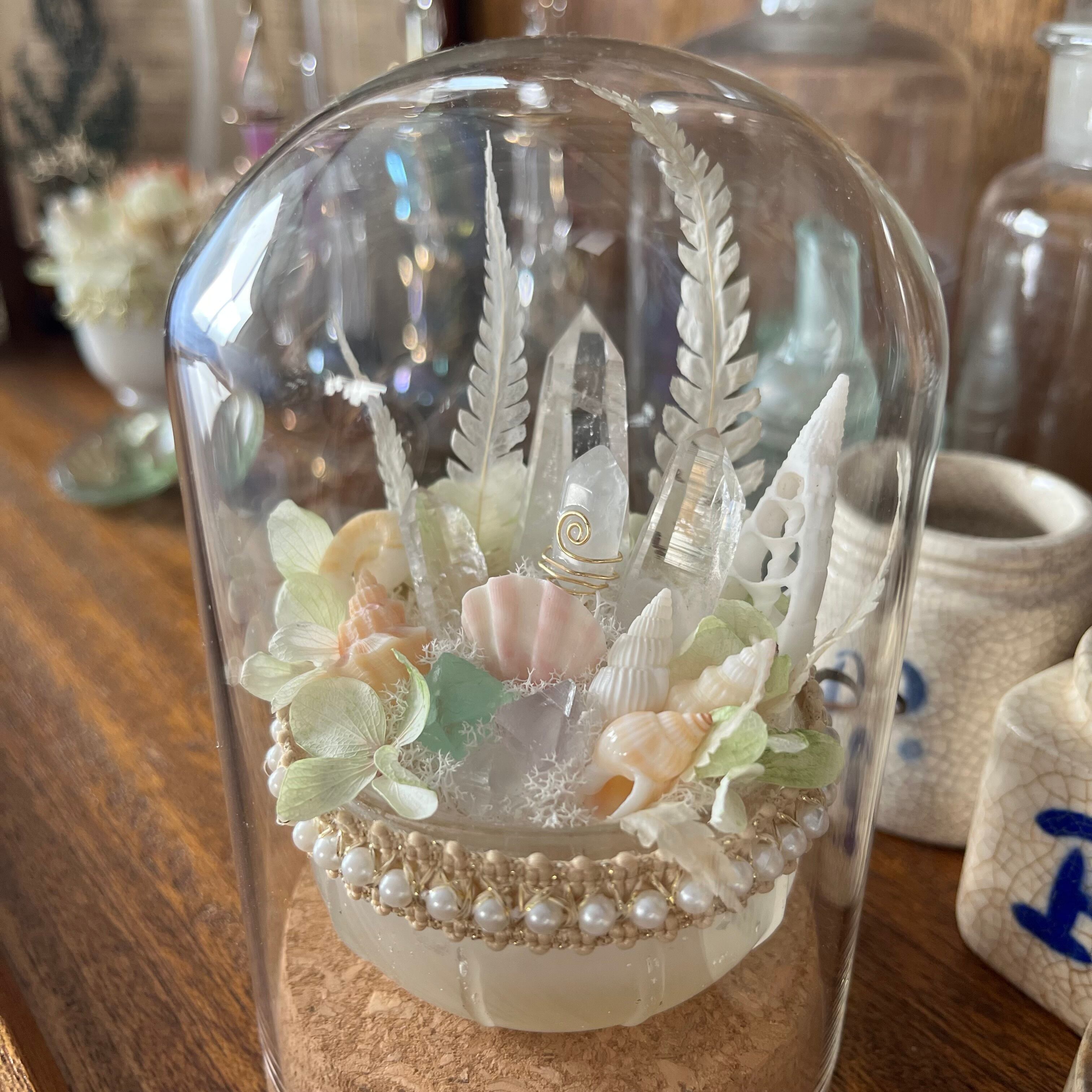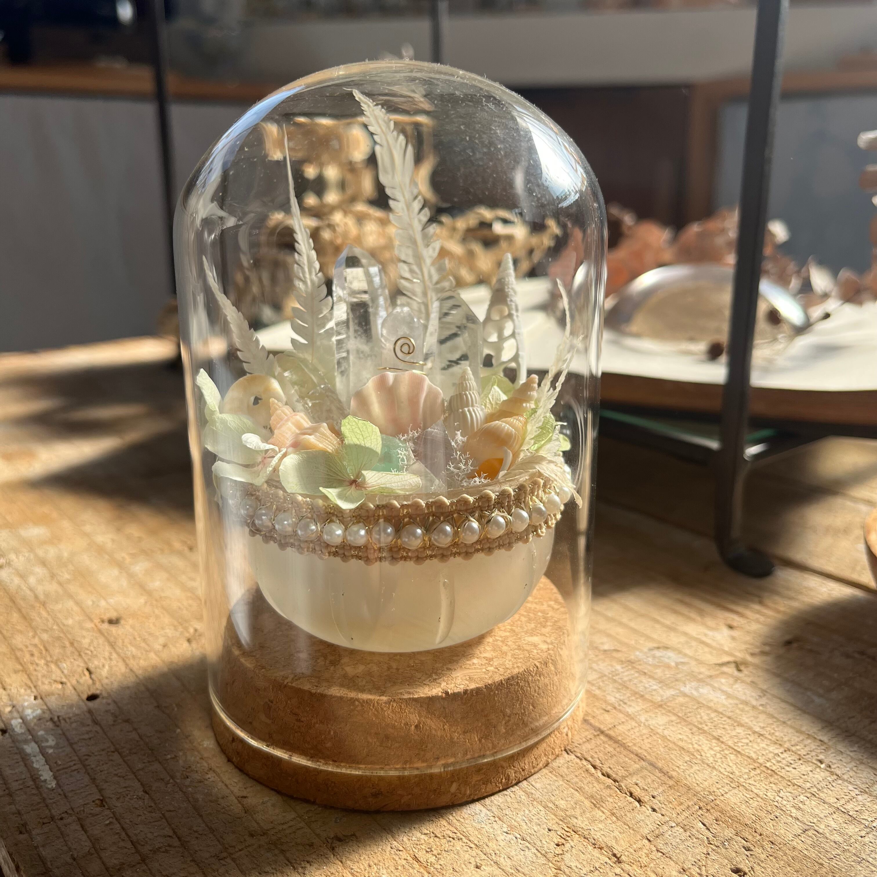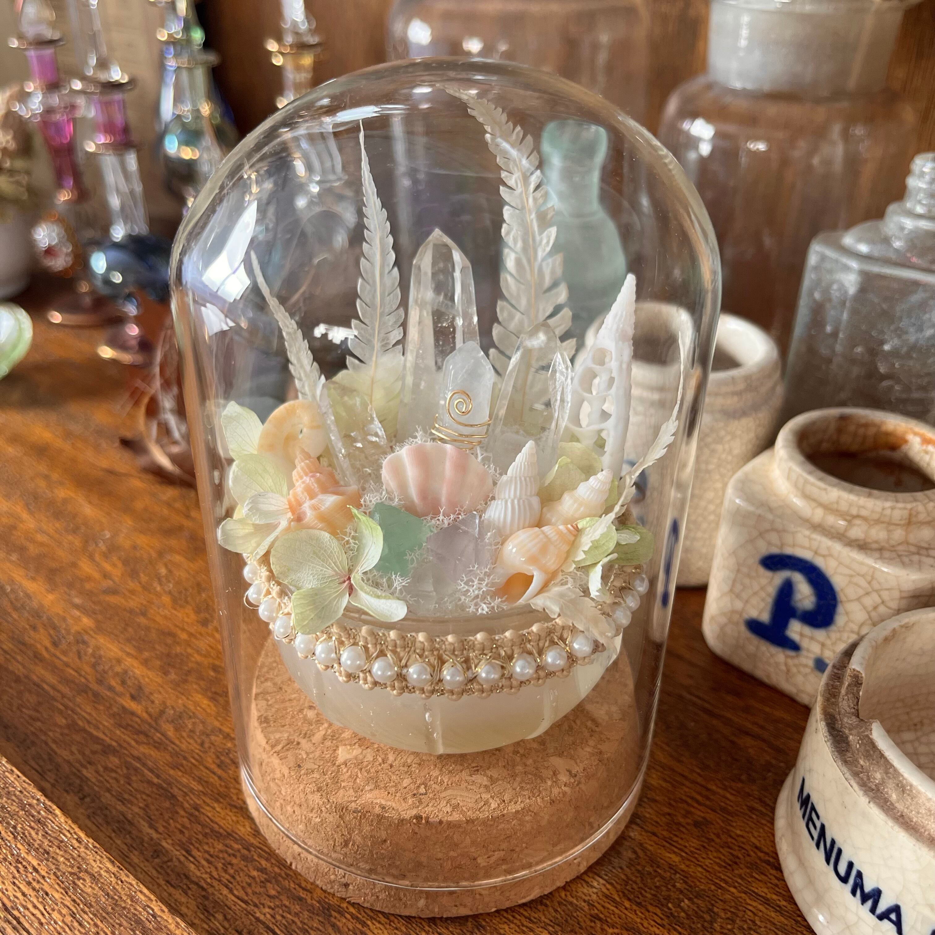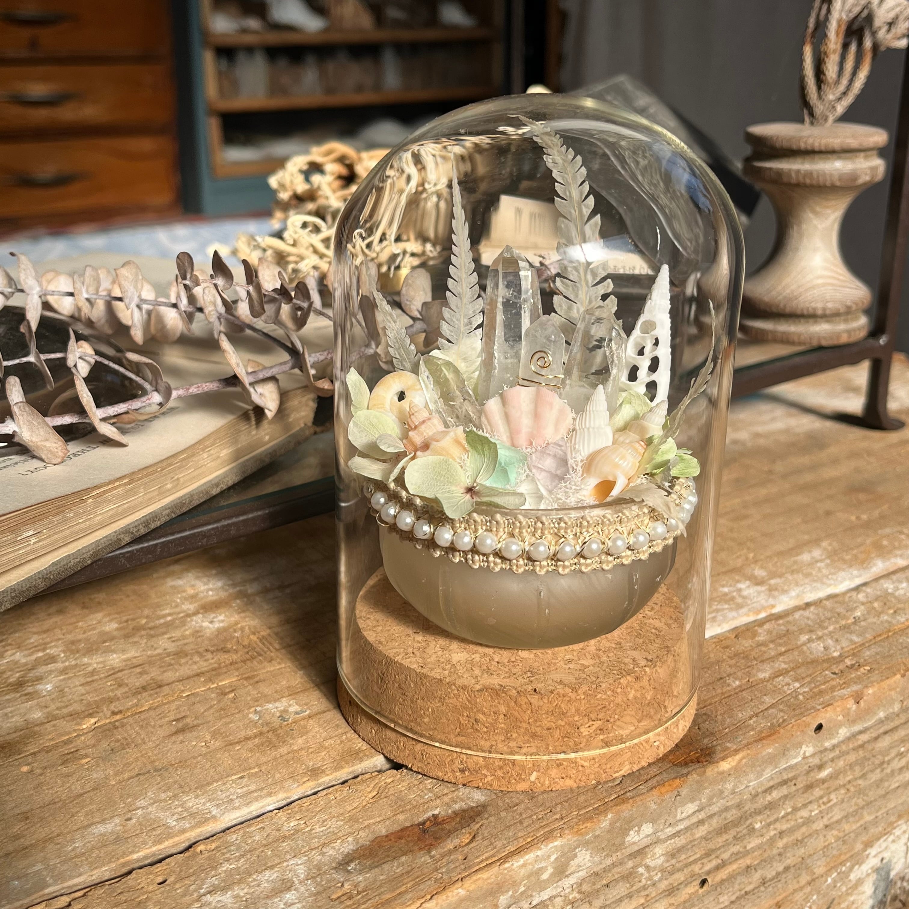 ボトルディギングでみつけた 古いガラスを活かすべく、山と海の宝物を集め、淡く 柔らかな色合いでまとめました。