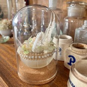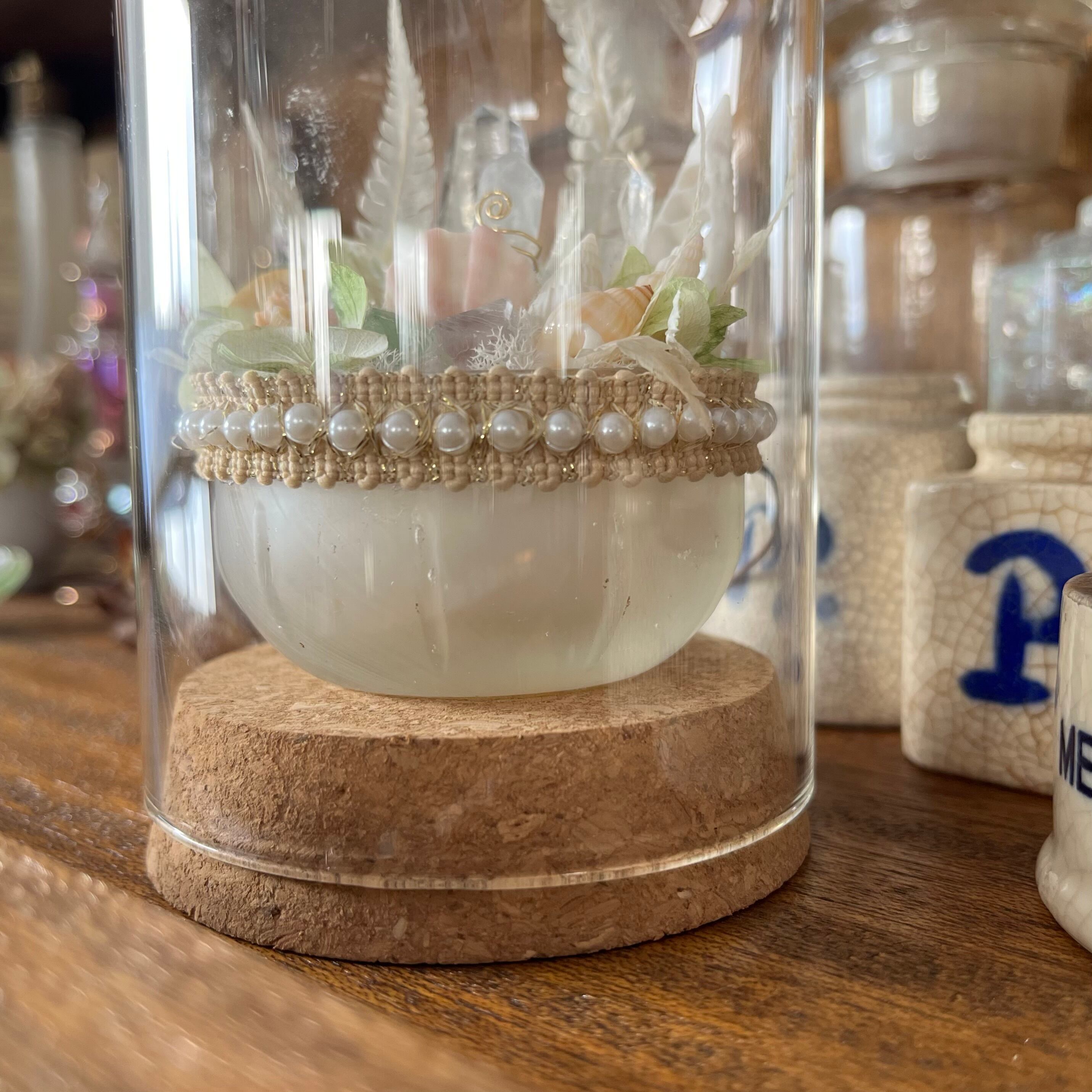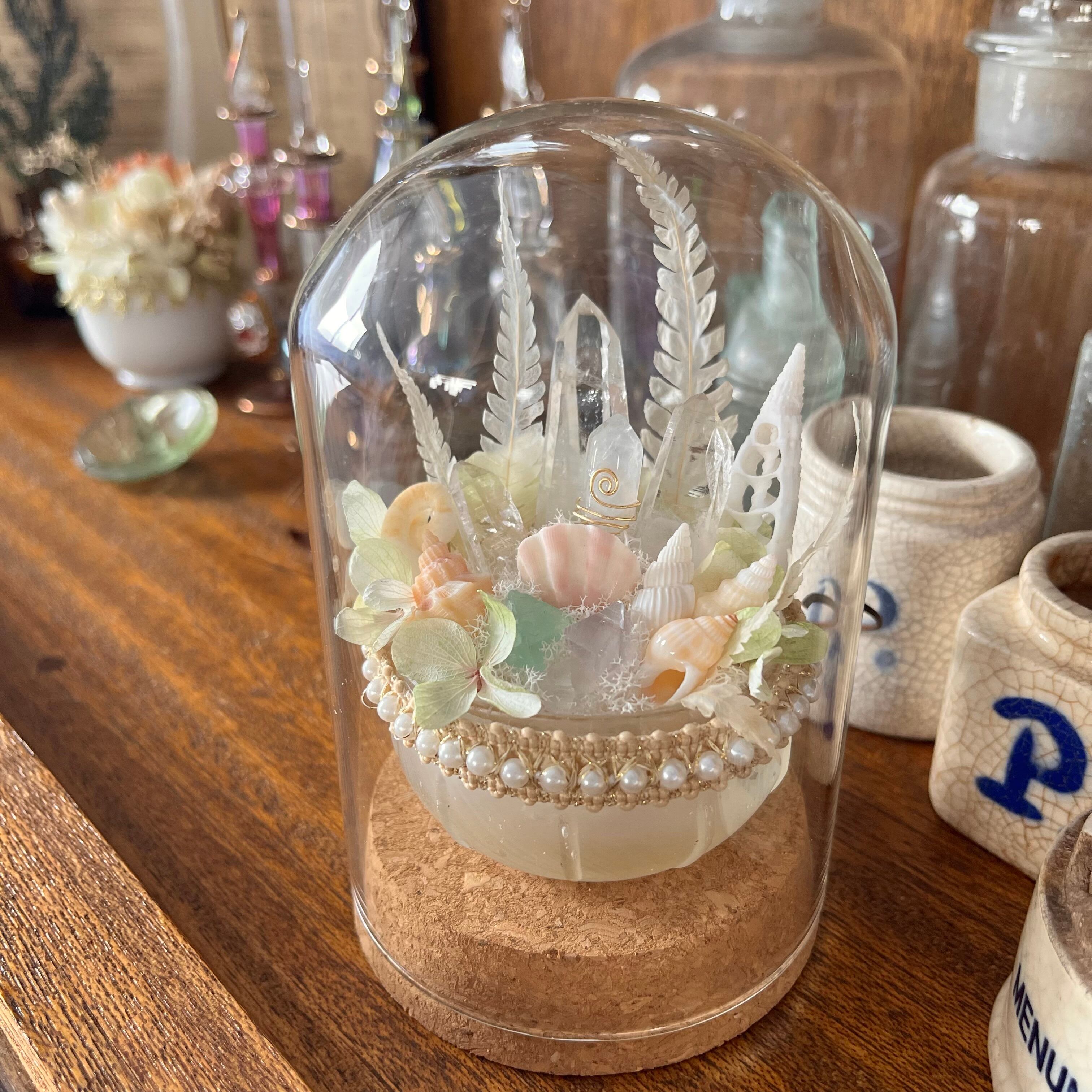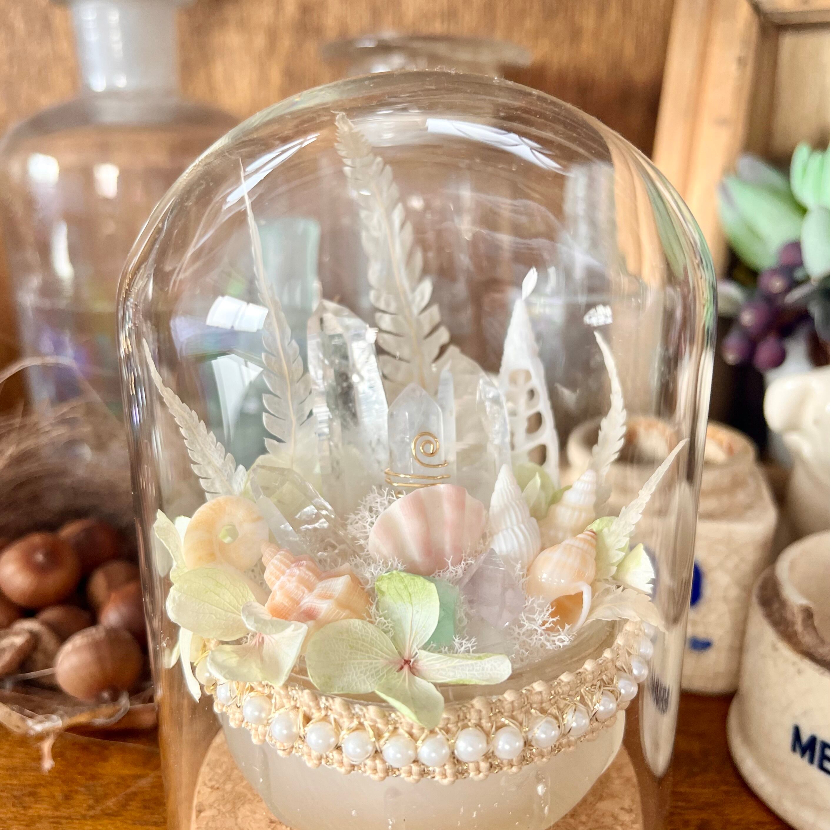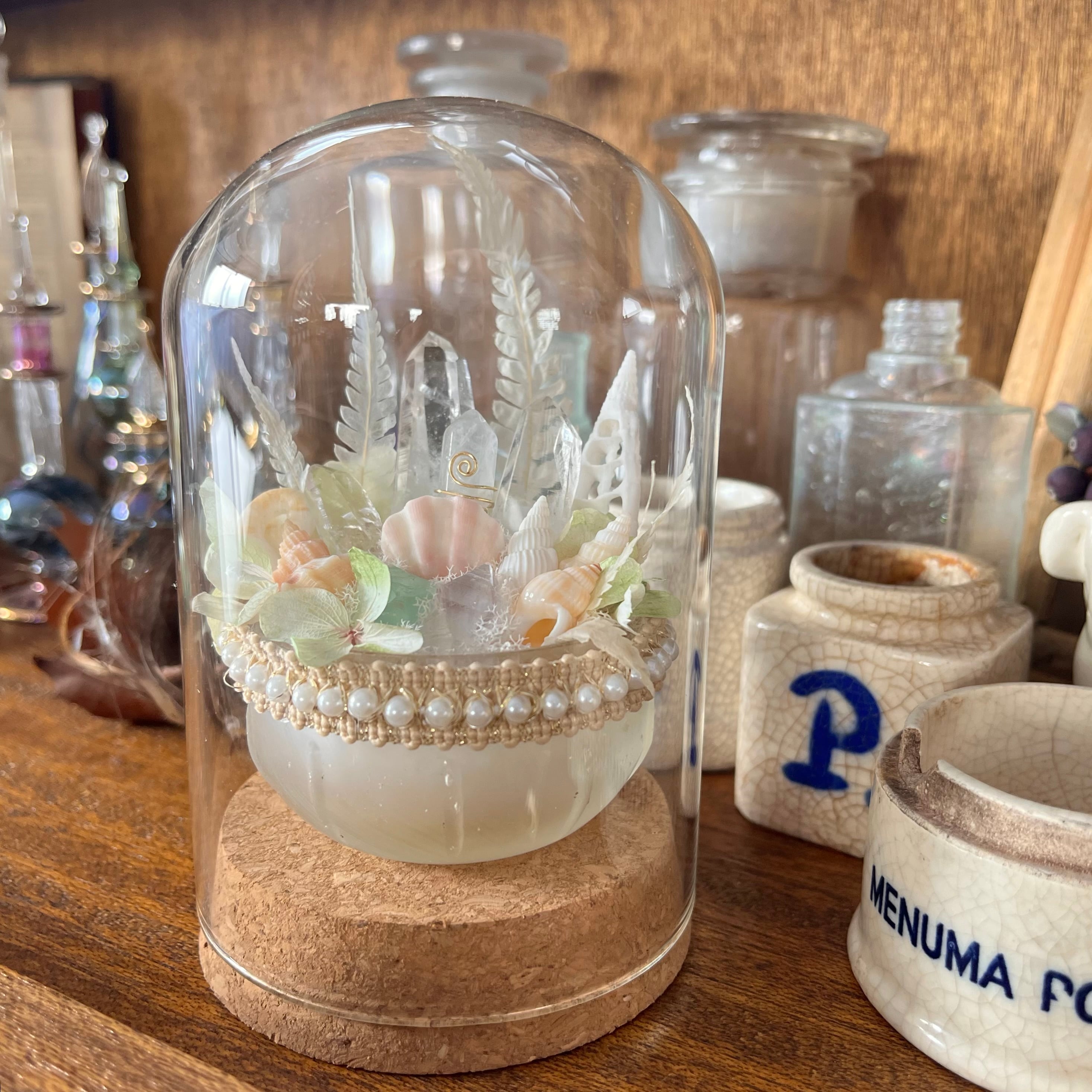 ボトルディギングでみつけた 古いガラスを活かすべく、山と海の宝物を集め、淡く 柔らかな色合いでまとめました。