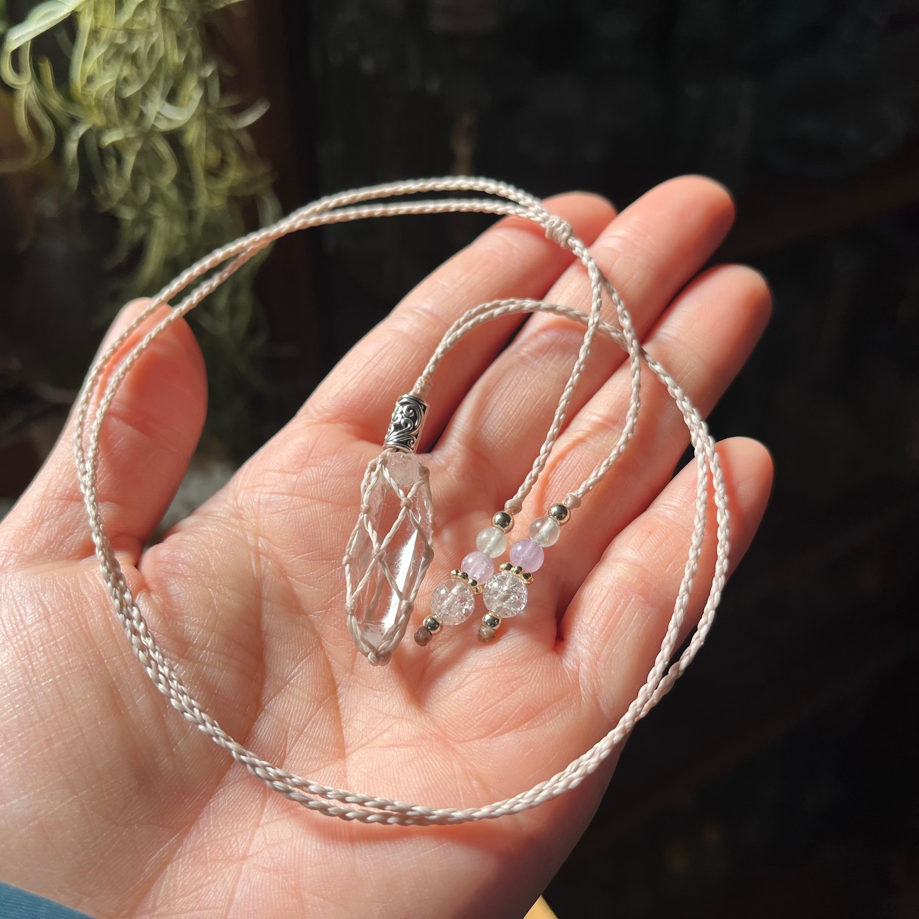 水晶に合わせて マクラメの技法でホルダーを編みました。出し入れ可能なので、サイズが合えば、お手持ちの宝物を身につけていただけます。自然のままの水晶も 楽しんでいただけます。